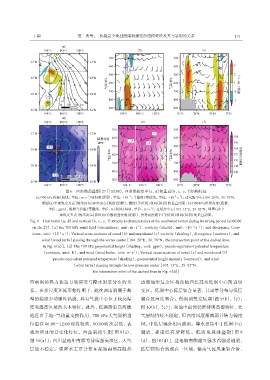 图6 西南涡鼎盛期(27日00:00), 西南涡的水平(a, d)和垂直(b, c, e, f)结构特征