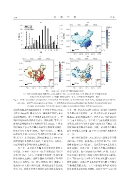 (a)中国多年逐月降水的平均值(单位: mm), 标准差(单位: mm)和变异系数, (b)冬季降水的多年平均值(填色)和