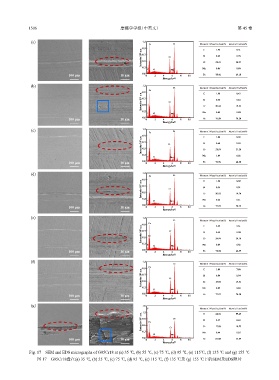 图 17 G95Cr18盘在(a) 35 ℃, (b) 55 ℃, (c) 75 ℃, (d) 95 ℃, (e) 115 ℃, (f) 135 ℃及 (g) 155 ℃下的SEM及EDS照片