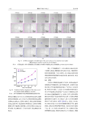 图 15 不同线速度下2种不锈钢磨损表面形貌的LCSM照片和磨损区域表面粗糙度:(a) 9Cr18;(b) 9Cr18MoV