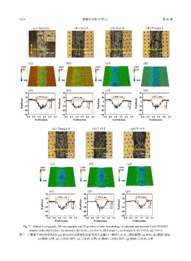 图 7 干摩擦下基材和织构化CuAl10Fe5Ni5试样磨损形貌的光学显微和三维照片以及二维轮廓图:(a) 基材;(b) 椭圆-线性;
