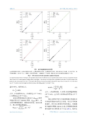 (a) 训练集回归分析图,(b) 验证集回归分析图,(c) 测试集回归分析图,(d) 整体回归分析图。图中○横坐标是目标值,用字母 T 表示,纵