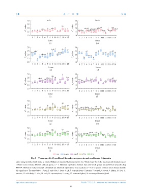 Fig. 1 Tissue-specific C t profiles of five reference genes in male and female S. japonica