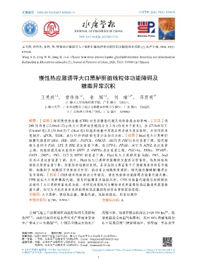 及 IL-8 表达量显著下调。此外,Heat 组大口黑鲈肝脏糖原及脂质异常蓄积,线粒体结构