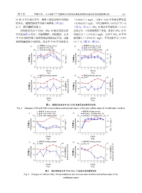 硝化桶进出水中 TAN、NO -N − 浓度及其去除 急剧上升,中后期逐渐趋于平稳,进水中 NO -N − 平
