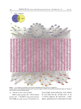 A: Venn diagram of the intersection between active component targets of ZTKCW and hypertension-associated targets; B: Network of